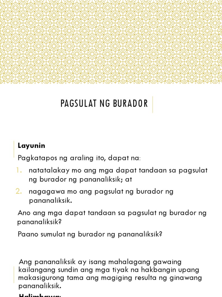 Balikan at basahing muli ang. Pagsulat ng burador o Rough Draft. Nakapaloob dito ang pagsulat ng burador o draft.