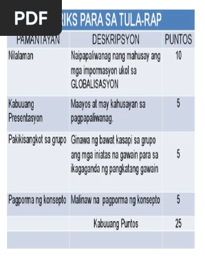 RUBRIC SA PAGSULAT NG TALUMPATI PARA SA ISANG PANAYAM PANG-INDIBIDWAL Pangalan. At dahil ito ay isang sining ito ay may pamantayang estetiko at nangangailangan ng disiplina. Isang sining ang pagtula.