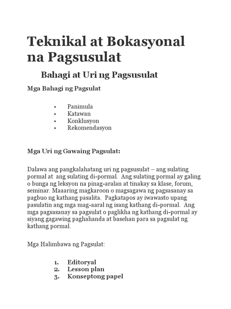 Bezglasnaaz and 117 more users found this answer helpful. 1 3 Isang espesyalisadong anyo ng komunikasyon na karaniwang inihahalintulad sa iba pang uri ng pagsulat bagaman ito ay may tiyak na awdiyens layunin estilo pormat sitwasyon nilalaman at gamit na siyang pangunahing elemento ng komunikasyong teknikal. Kailangan ding walang maling gramatikal walang pagkakamali sa bantas at may angkop na pamantayang kayarian.