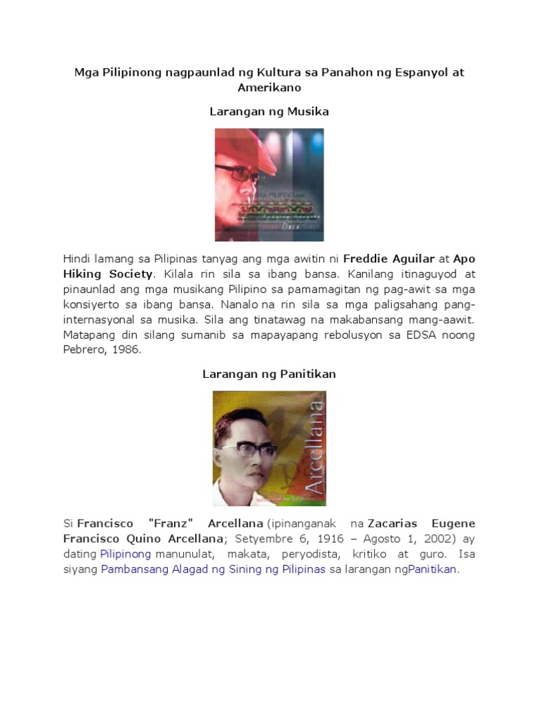 Mga Pilipinong Nagpaunlad Ng Kultura Sa Panahon Ng Espanyol At Amerikano