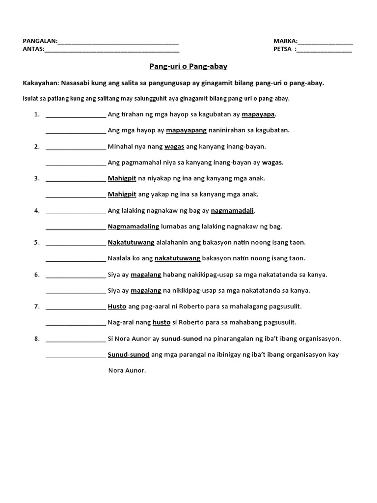 Ang mga hayop ay mapayapang naninirahan sa kagubatan. Minahal niya nang wagas ang kanyang inang-bayan. 3 question Isulat sa patlang kung ang salitang may salungguhit ay ginagamit bilang pang-url pang-abay1.