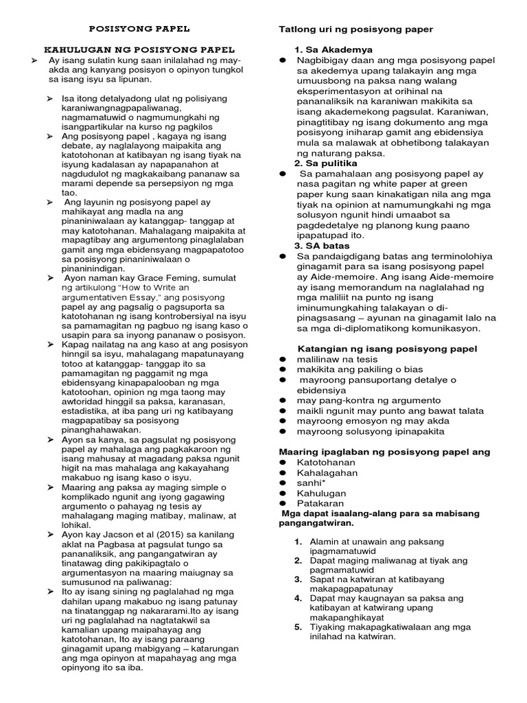 Buksan lamang sa ilalim ng bangka ang halos tulad ng kung paano namin ginawa sa mga triangles at ang bangka ay dapat na tumayo sa sarili nitong. Base sa pangalan ng papel na ito posisyong papel mahihinuha natin na syempre kukuha tayo ng posisyon natin at tungkol dito tayo magsusulat. Mga Hakbang sa Pagsulat ng Posisyong Papel Ang pagsulat ng posisyong papel ay hindi lamang sining ng paglalahad ng mga argumento at pangangatwiran kundi ito rin ay isang agham na kinapapalooban ng mga katibayang kinalap sa pamamagitan ng pananaliksik.