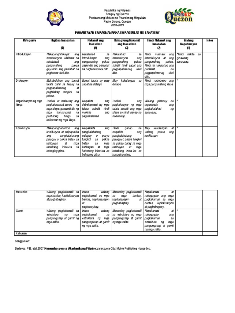 Rosario Integrated School 2 years ago. Save Rubric PAgsulat Ng Sanaysay Filipino V For Later. Dalawa lang ang sanhi kapag nahihirapan magsulat ng sanaysay.